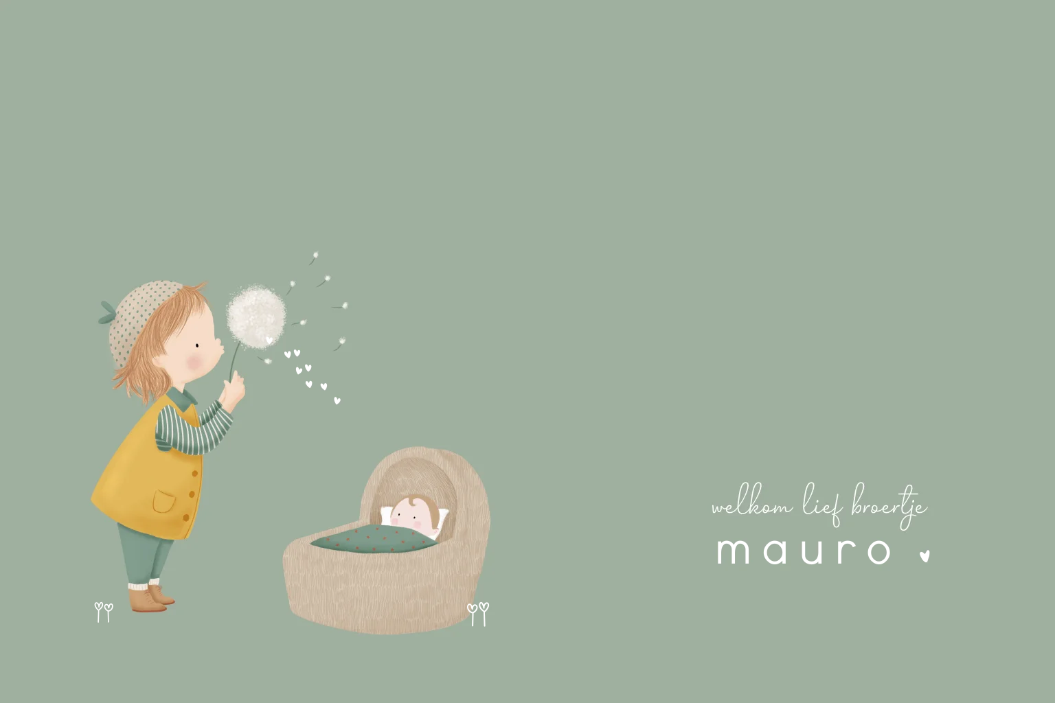 Een lief en dromerig geboortekaartje voor een broertje met een kindje dat een paardenbloem blaast. De zachte groentint en goudfolie details zorgen voor een warme, rustige uitstraling. Een stijlvol en tijdloos geboortekaartje dat je eenvoudig aanpast naar wens.