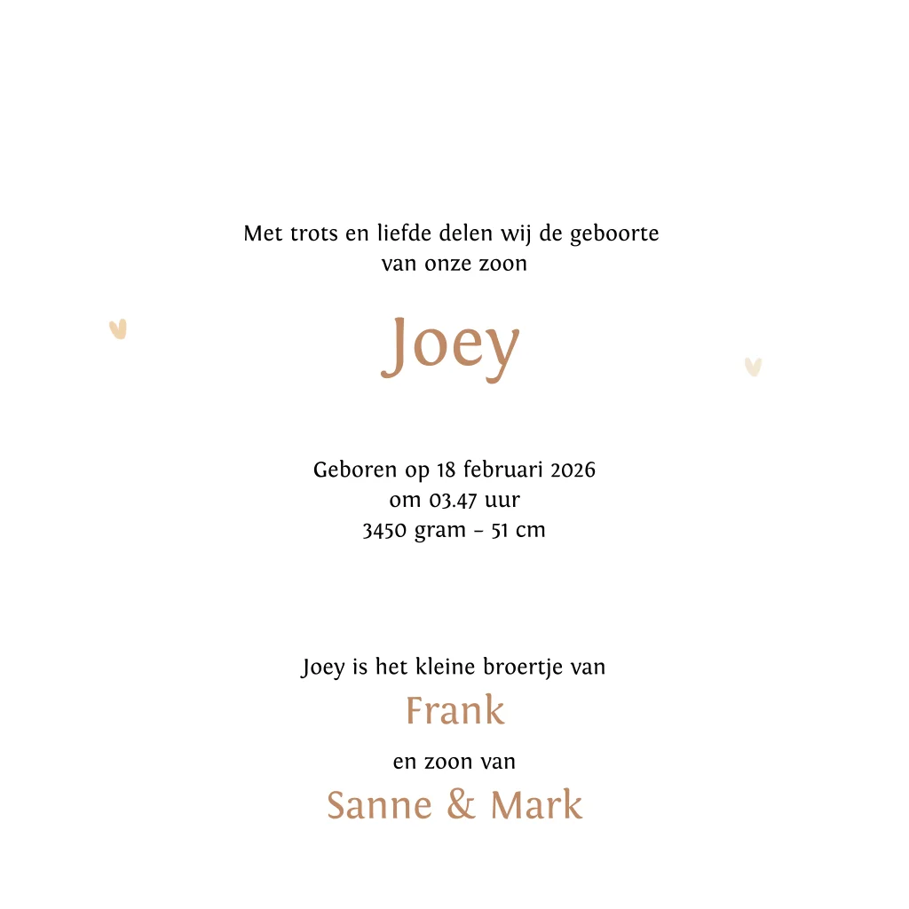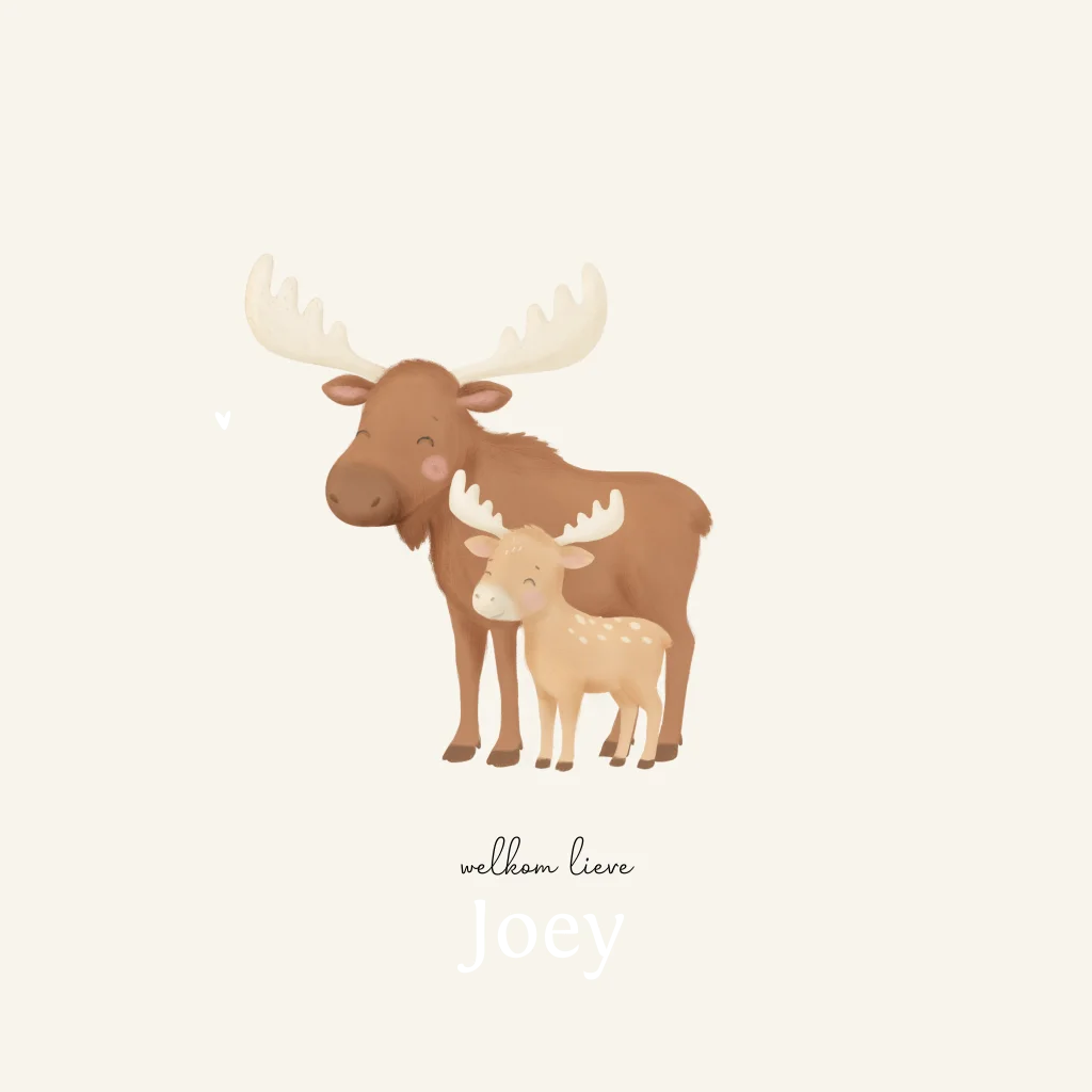 Zacht, warm en vol liefde. Dit neutrale geboortekaartje met eland en kleintje is perfect voor een herfst- of winterbaby. Tijdloos geïllustreerd in warme aardetinten en volledig te personaliseren in onze editor. Voor wie houdt van natuurlijk, rustig en nét even anders.