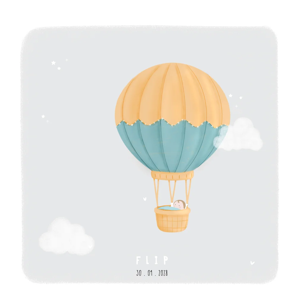 Geboortekaartje jongen blauwe luchtballon en goudfolie sterren