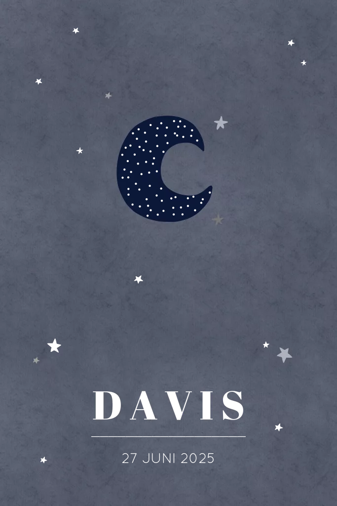 Dit geboortekaartje heeft een betoverend thema van maan, sterren en holografische folie. De diepblauwe achtergrond en de glinsterende sterren in holografische folie creëren een prachtige sterrenhemel voor de geboorte van jullie zoon of dochter. Pas naar wens aan voor een geboortekaartje dat net zo speciaal is als jullie kleintje.