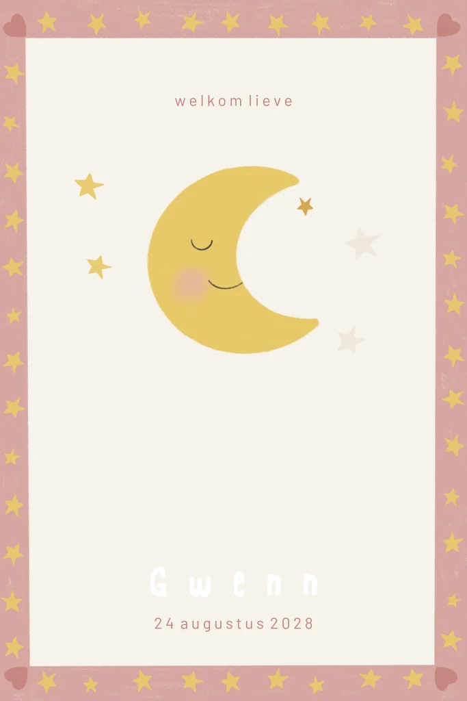 Een zacht en dromerig geboortekaartje met een lieve maan en sterrenrand in warm roze. Tijdloos, rustig en vol kleine details. Personaliseer eenvoudig in de editor en maak het kaartje helemaal eigen.