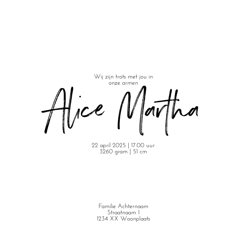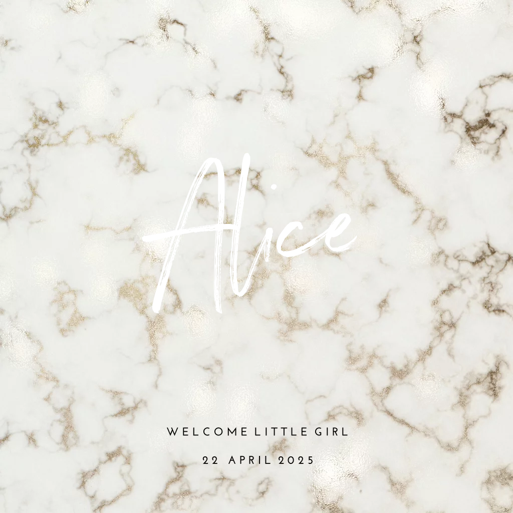 Een stijlvol en minimalistisch geboortekaartje dat zeker zal opvallen bij familie en vrienden. Met marmer motief en de naam van jullie kindje in roséfolie. Liever een andere kleur folie? Dit kun je eenvoudig aanpassen in de editor. Aan de binnenzijde kun je een foto van jullie kindje plaatsen voor een zeer persoonlijk en uniek geboortekaartje.