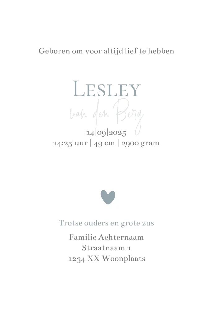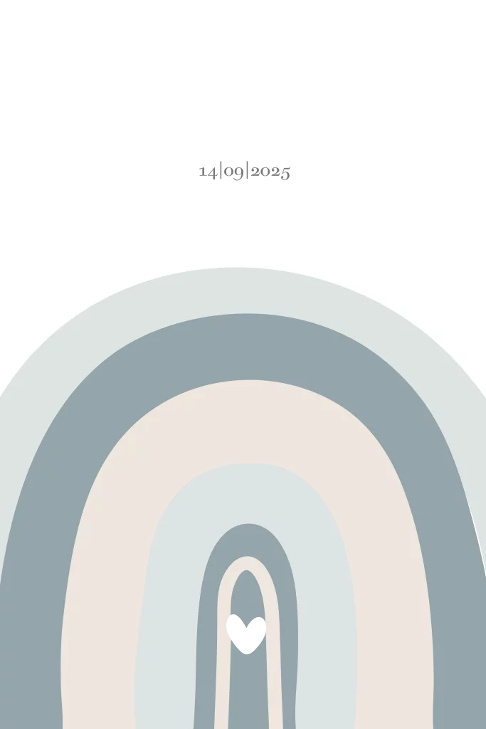 Een lief geboortekaartje met blauw groene regenboog en goudfolie. Je kunt zelf kiezen welke kleur folie je wilt en ook kun je het lettertype en de achtergrondkleur aanpassen.