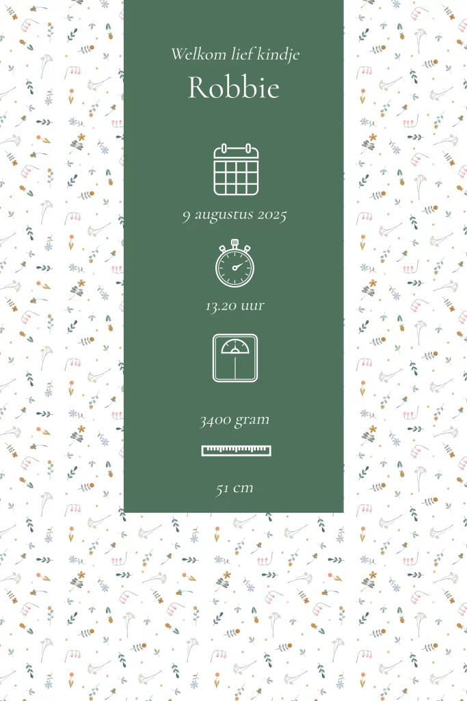 Een lief geboortekaartje met kleine bloemetjes, goudfolie en ronde hoeken. De kleur van de folie kun je aanpassen in de editor. Na de geboorte kun je eenvoudig de foto van jullie kindje toevoegen op de achterzijde voor een heel persoonlijk en origineel geboortekaartje.