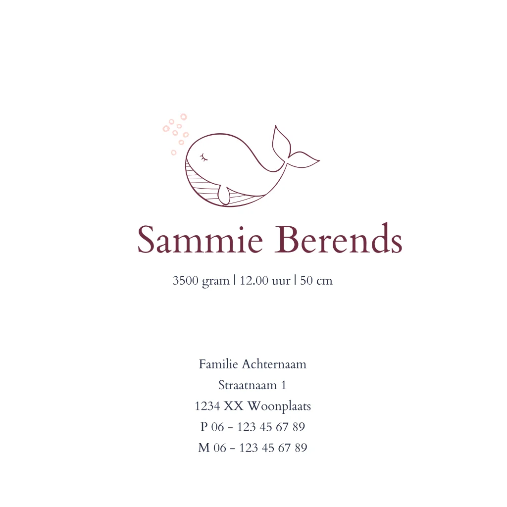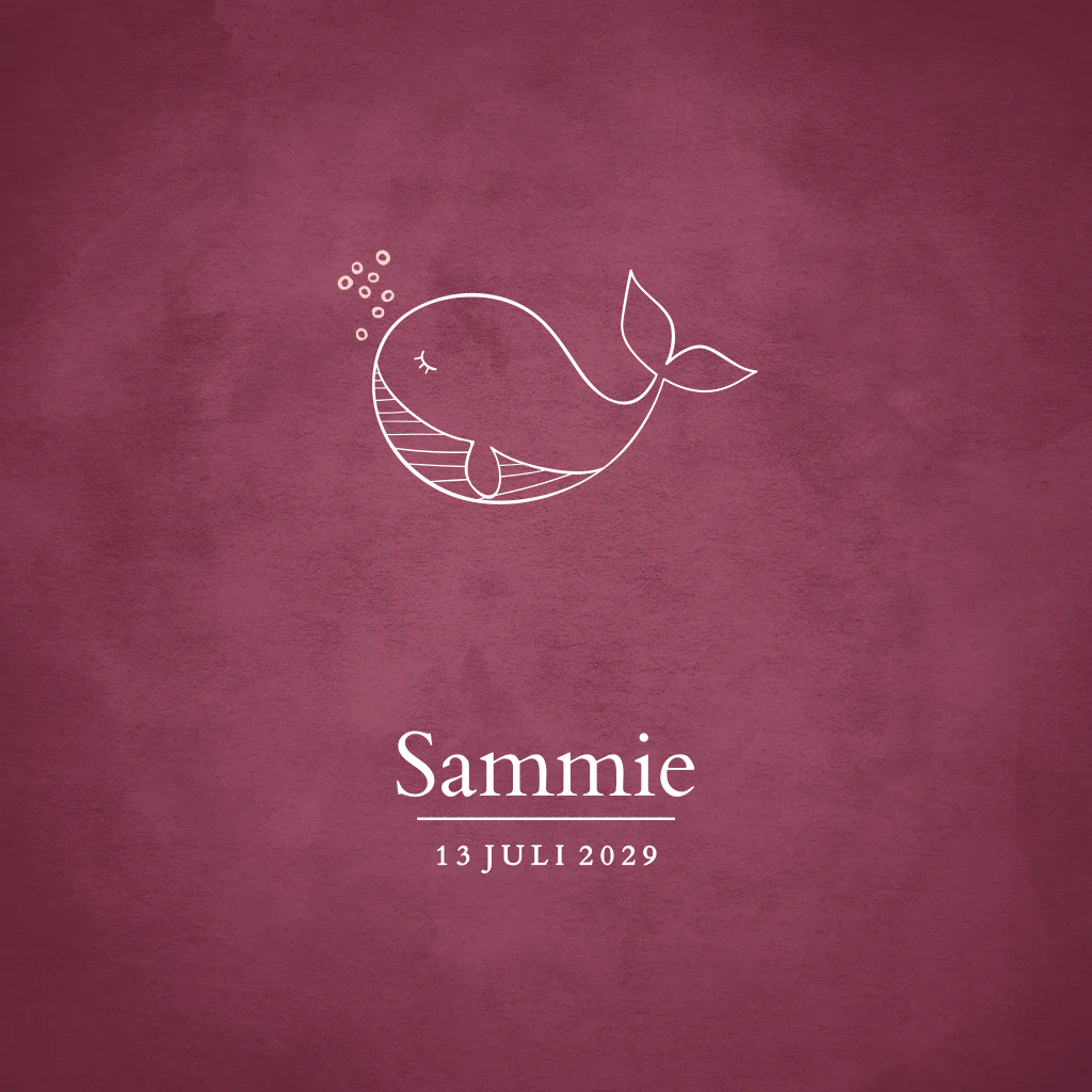 Een lief geboortekaartje voor een jongen of meisje met walvis in goudfolie en velvet look in donkerrood. Ook verkrijgbaar in donkerblauw. De kleur van het folie en de lettertypes kun je nog helemaal naar jullie wensen aanpassen.