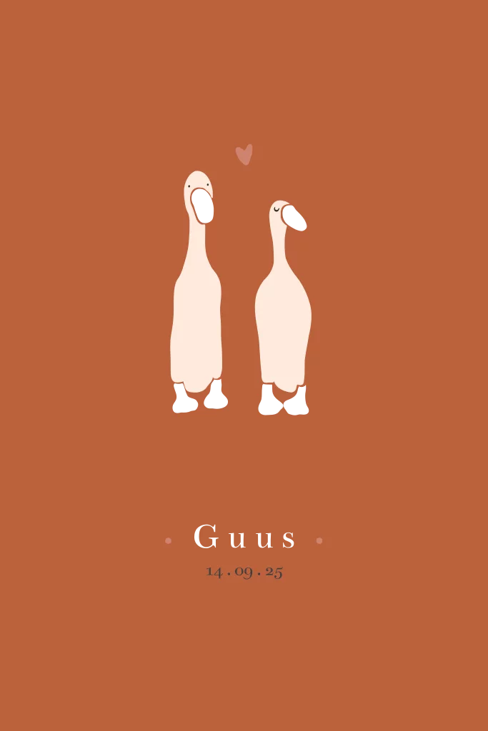 Een lief geboortekaartje voor een jongen met schattige eendjes met goudfolie details op een roestbruine achtergrond. De kleuren en lettertypes kun je eenvoudig aanpassen zodat het geboortekaartje helemaal bij jullie past.
