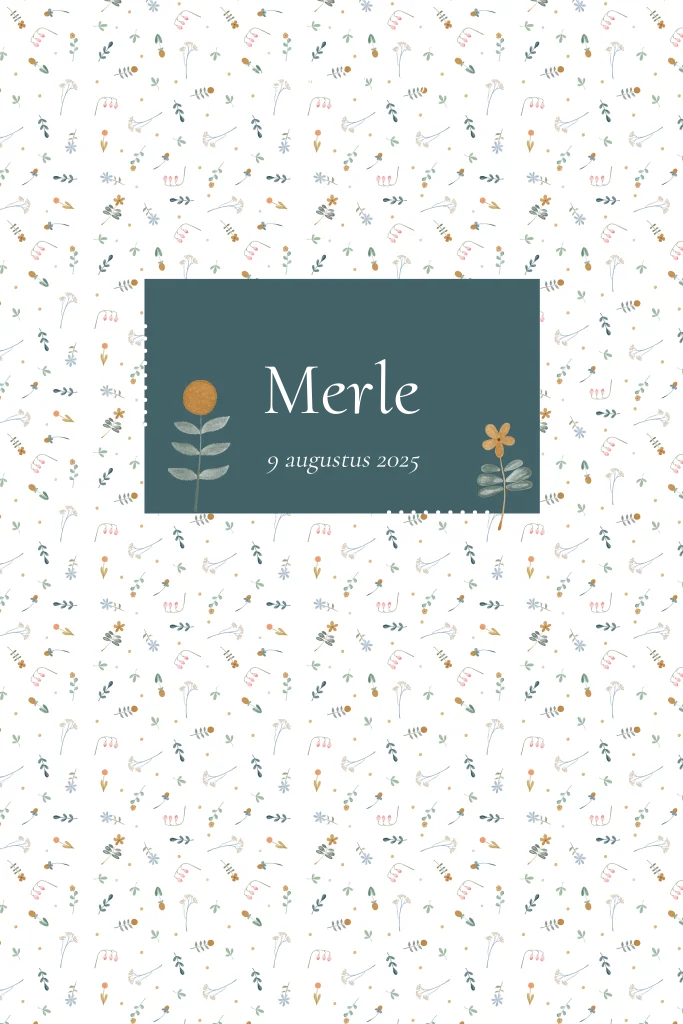 Een lief geboortekaartje in petrol met kleine bloemetjes, goudfolie icoontjes en rechte hoeken. Ook verkrijgbaar met ronde hoeken.