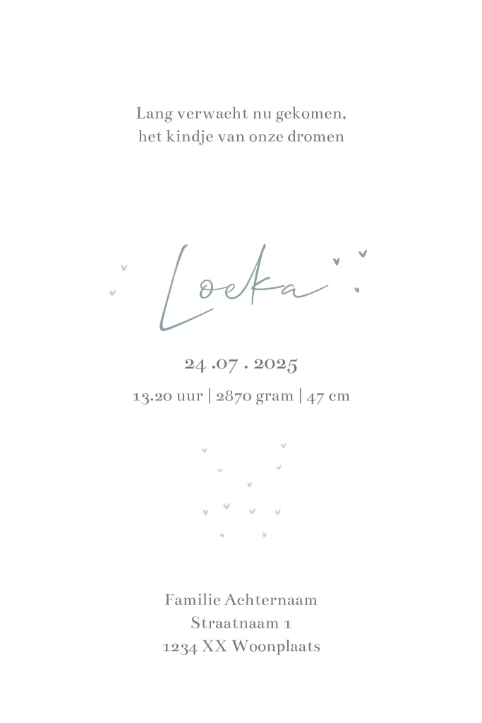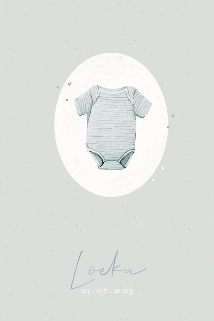 Een lief geboortekaartje met rompertje in waterverf. Leuk voor zowel jongens als meisjes. Met naam en details in hoogglans.