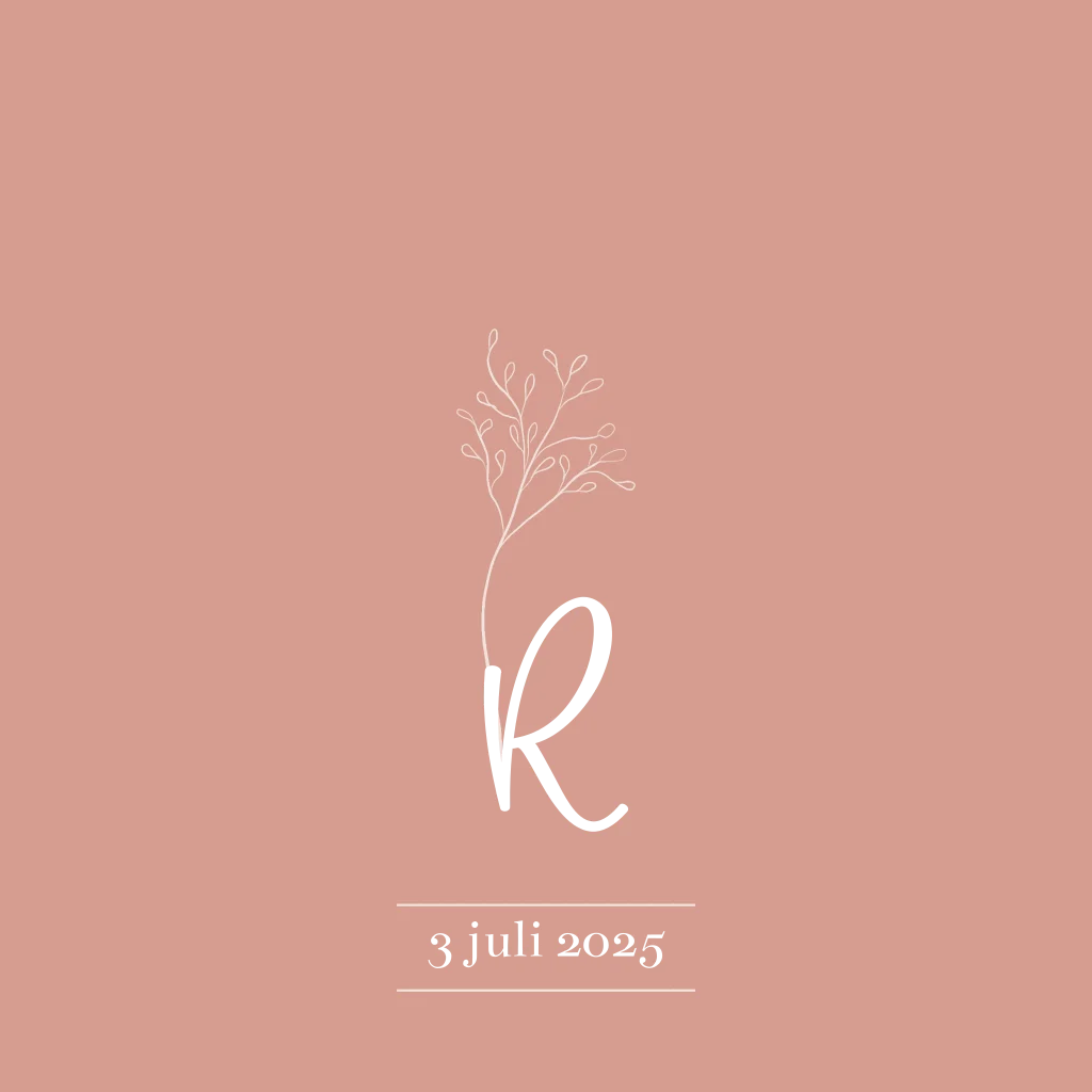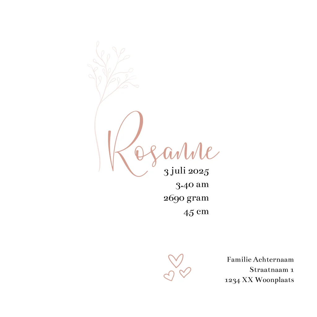 Een minimalistisch meisjes geboortekaartje met getekend takje en initiaal in roséfolie. De achtergrondkleuren en de kleur van het folie kun je eenvoudig aanpassen in de online editor zodat het geboortekaartje helemaal bij jullie past.