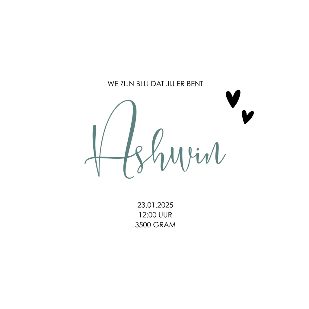 Bij dit minimalistische geboortekaartje hebben wij gekozen voor een trendkleur van nu in combinatie met zwarte hoogglans. Liever een andere kleur achtergrond of folie? Dit kun je eenvoudig aanpassen in de kaartopmaker.