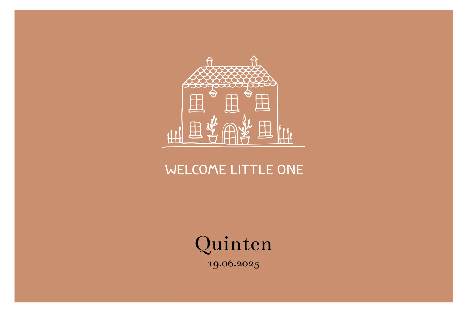 Een stijlvol geboortekaartje om de geboorte van jullie zoon of dochter aan te kondigen. De bruine achtergrondkleur kun je eenvoudig aanpassen naar wens. Het huisje en de tekst Welcome Little One worden gedrukt in goudfolie. Maar dit kan natuurlijk ook in een andere foliekleur.