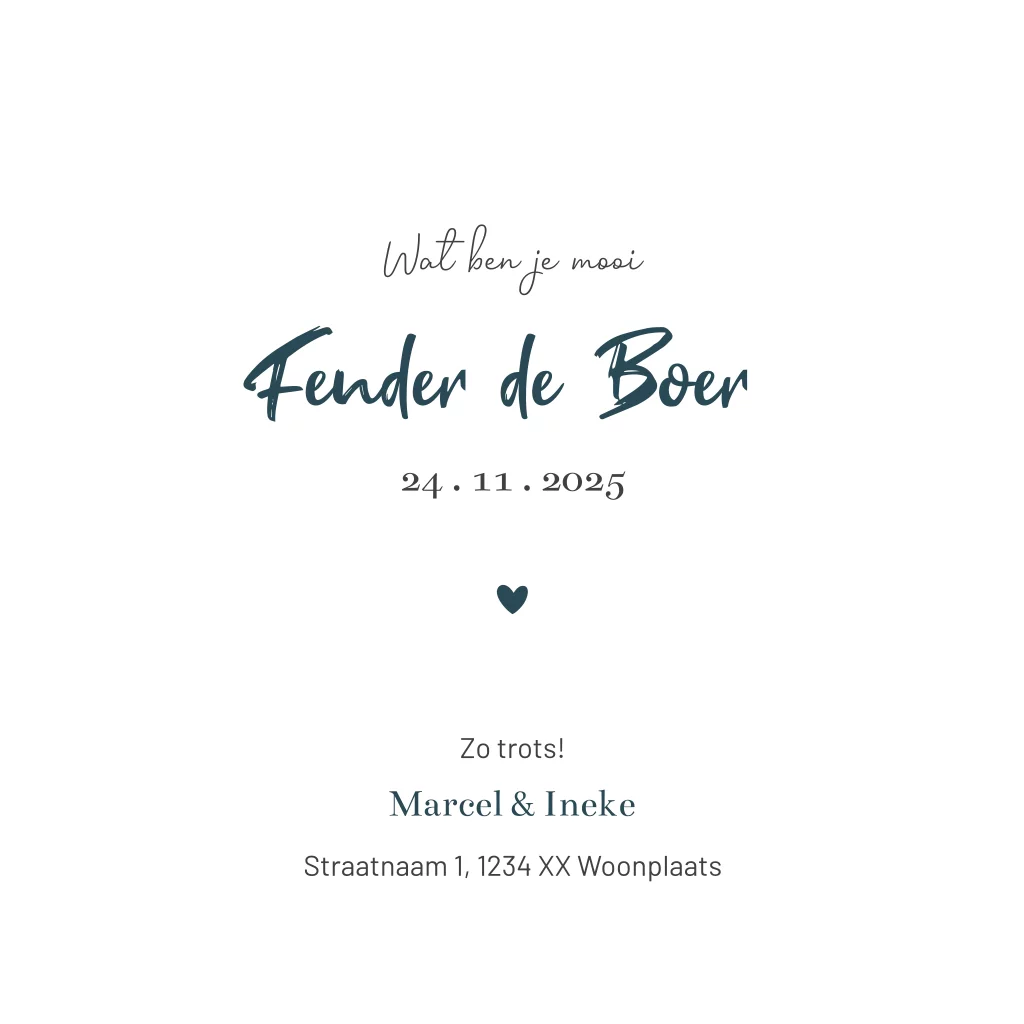 Trendy geboortekaart met goudfolie spetters en hartje. Dit geboortekaartje heeft een velvet-look achtergrond in petrol blauw. De kleur van het folie en de lettertypes kun je naar wens aanpassen in de editor zodat het geboortekaartje helemaal bij jullie past.