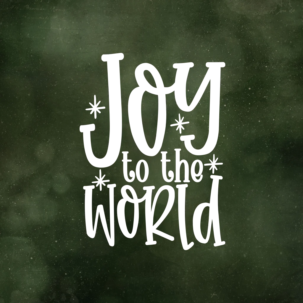 Chique kerstkaart met in feestelijke letters Joy to the world en sterretjes in goudfolie op een groene, waterverf achtergrond. De foliekleur is aan te passen in de editor.