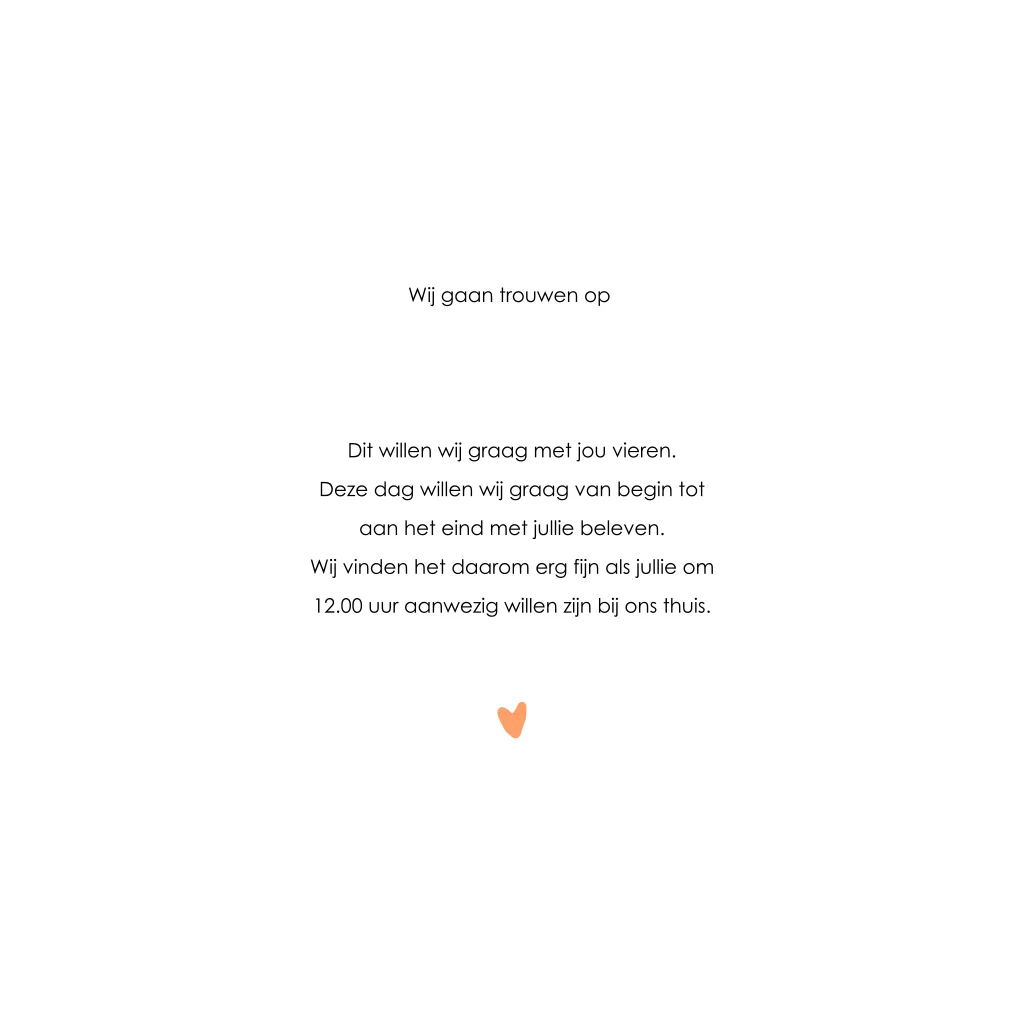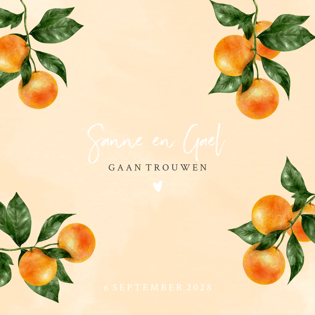 Trouwen jullie in de (na)zomer dan past deze vrolijke trouwkaart met sinaasappels en folie mooi bij de sfeer van jullie trouwdag. Kleurrijk en heel vrolijk. Aan de binnenkant van het kaartje kun je zelf een foto toevoegen maar deze kun je ook weghalen als je liever een trouwkaart zonder foto wilt.