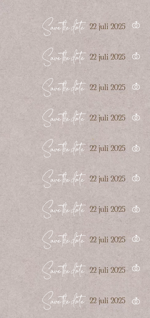 Een leuk DIY-label met jullie trouwdatum en trouwringen in goudfolie op een kraftlook achtergrond. De kleuren, het lettertype en het symbooltje kun je eenvoudig wijzigen zodat het helemaal bij jullie trouwkaarten past. Deze labeltjes knip of snijd je eenvoudig zelf met de hulplijntjes. Deze snijlijntjes kun je ook uitzetten of op de achterzijde zetten.