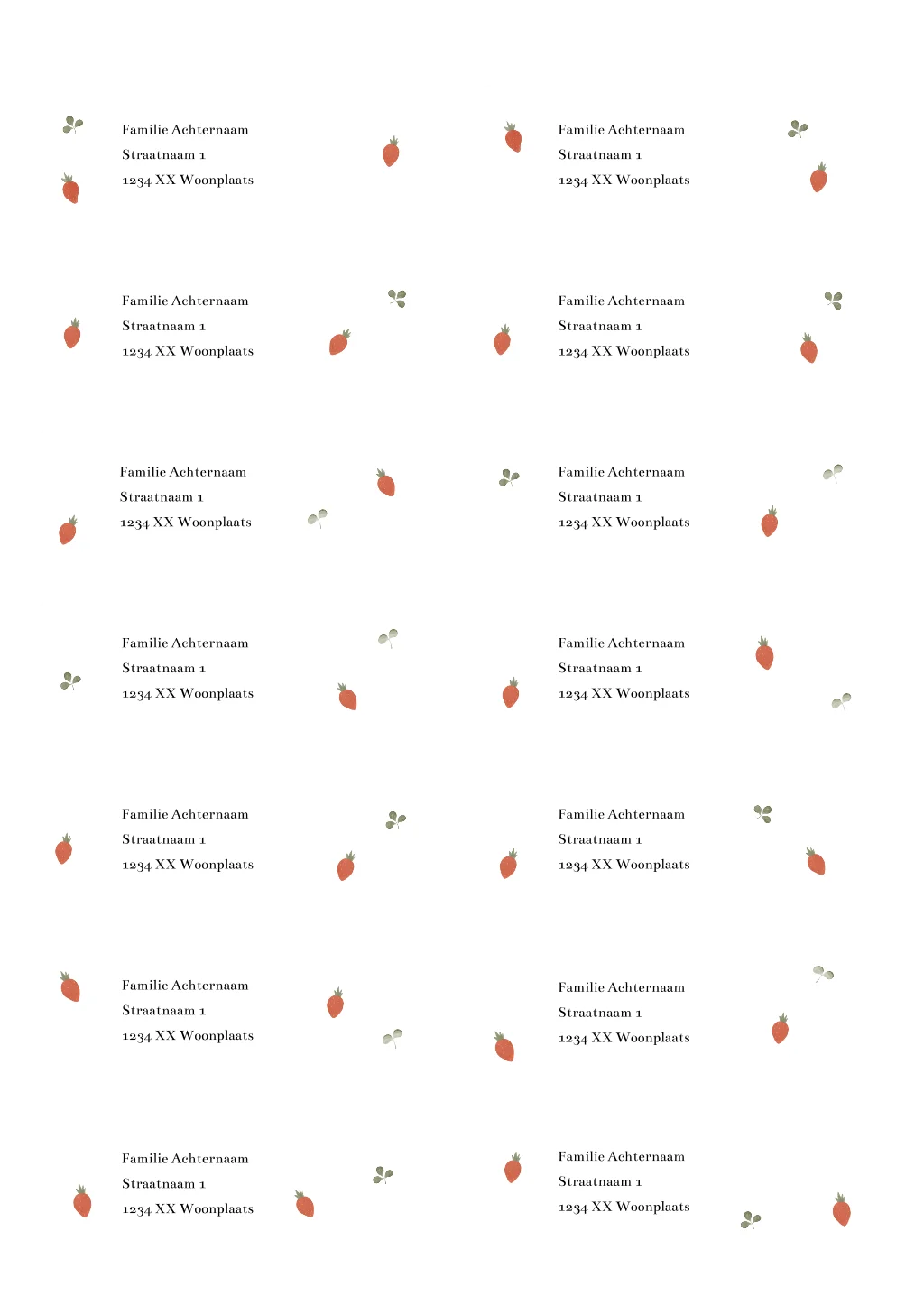 Deze adresstickers met kleine aardbeitjes en fijne blaadjes geven je geboortepost een frisse, lieve uitstraling. Speels en subtiel tegelijk, en perfect te combineren met een bijpassend geboortekaartje. Een vrolijk detail voor een bijzonder moment .