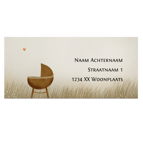 Mooie adressticker bijpassend bij dit geboortekaartje met illustratie van een lief wiegje en een hartje.