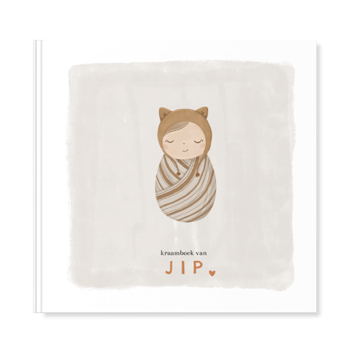 Een lief kraambezoekboek met illustratie van baby met bruin mutsje en kleertjes. Dit kraamboek is gemaakt in dezelfde stijl als het geboortekaartje en kan helemaal naar jouw wensen worden aangepast.