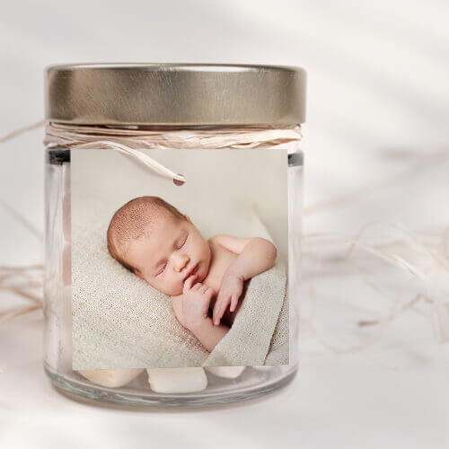 Geboortelabel vierkant met eigen foto. Bevestig de foto met een paperclip of touwtje aan je geboortekaartje. Het formaat is 40 x 40 mm en het label is voorzien van een stansgaatje, zodat je het makkelijk kunt bevestigen aan een geboortekaartje en/of -traktatie.