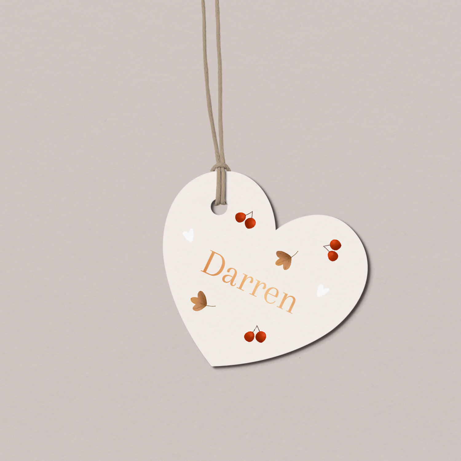 Label in de vorm van een hartje met koperfolie, besjes en takjes. Ideaal voor het versieren van geboortekaarten en/of -traktaties. Bekijk ook het bijpassende geboortekaartje.