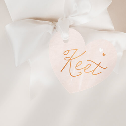 Het labeltje in hartjesvorm met roze waterverf achtergrond en de naam en een hartje in koperfolie. Het bevestigingsmateriaal kun je los bestellen en vind je bij de Extra producen.