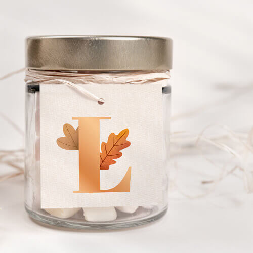 Leuk vierkant label met initiaal in koperfolie en herfstblaadjes. Ideaal voor het versieren van geboortekaarten, trouwkaarten en/of traktaties. Het bevestigingsmateriaal kun je los bestellen en vind je bij de Extra producen.