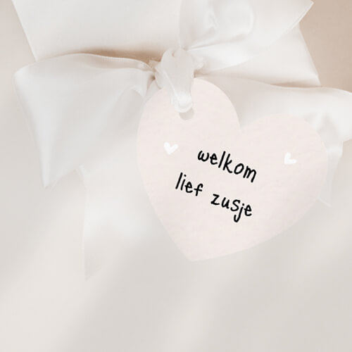 Lief labeltje in de vorm van een hartje met de tekst Welkom lief zusje. De tekst en de kleuren kun je eenvoudig zelf aanpassen zodat het labeltje perfect bij jullie geboortekaartjes of traktaties past. Het bevestigingsmateriaal kun je los bestellen en vind je bij de Extra producen.