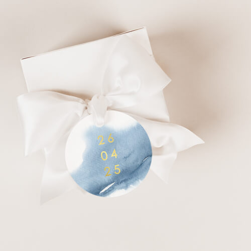 Rond label met blauwe waterverf voor het versieren van geboortekaarten, trouwkaarten en/of traktaties. Bewerk het labeltje in de editor zodat het helemaal naar jouw wens is.