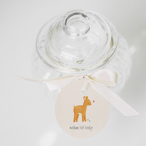 Een rond label met schattig hertje is perfect voor het toevoegen van een persoonlijk tintje aan de aankondiging van de geboorte van je kindje. Het bevestigingsmateriaal kun je los bestellen en vind je bij de Extra producen.