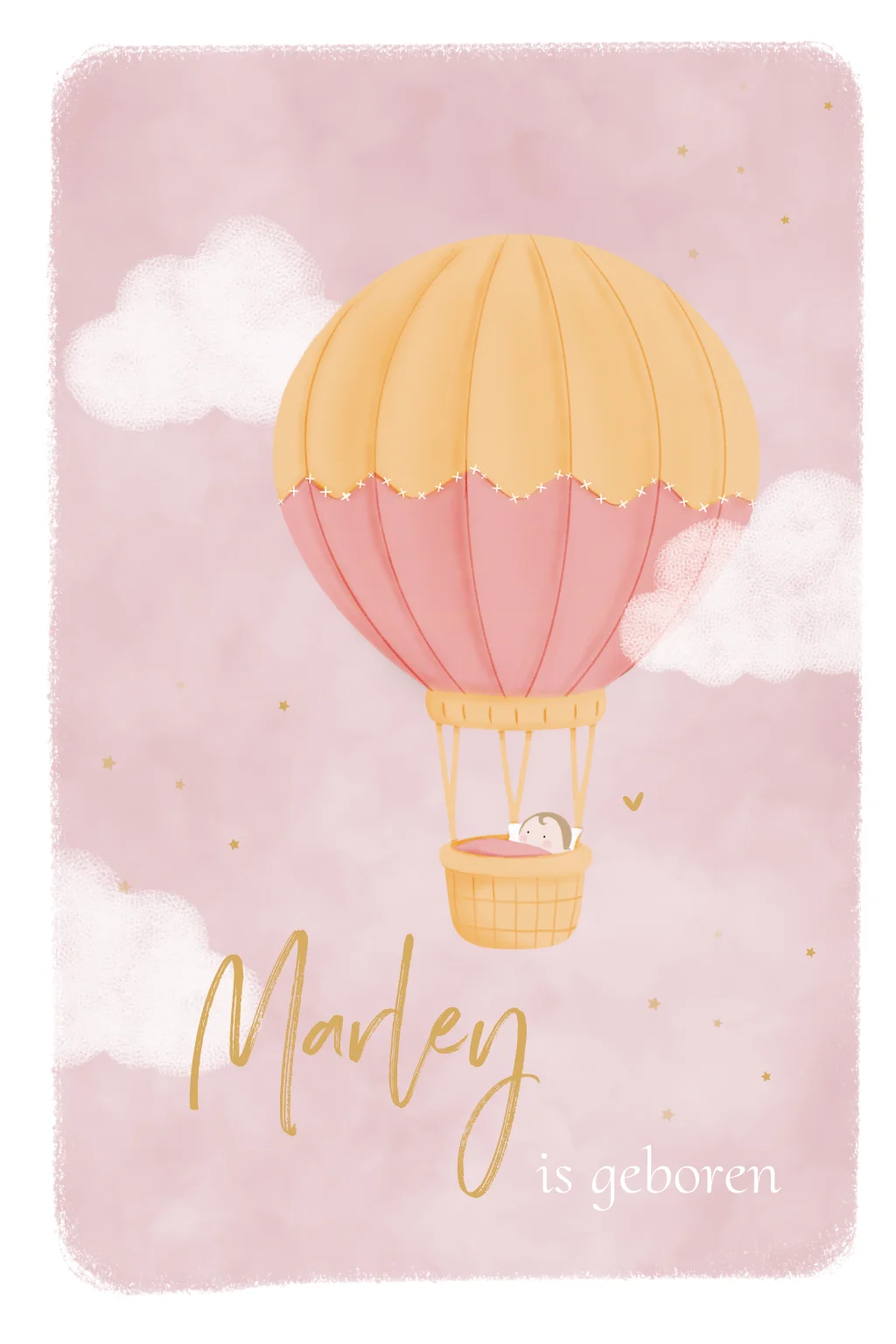 Vier de geboorte van jullie dochter groots met dit dubbelzijdige raambord, perfect passend bij het lieve geboortekaartje met roze luchtballon. Het bord heeft een zachte roze achtergrond met wolkjes en een dromerige illustratie van een luchtballon waarin jullie kleintje ligt. Een betoverende en feestelijke manier om iedereen te laten weten dat jullie meisje geboren is.