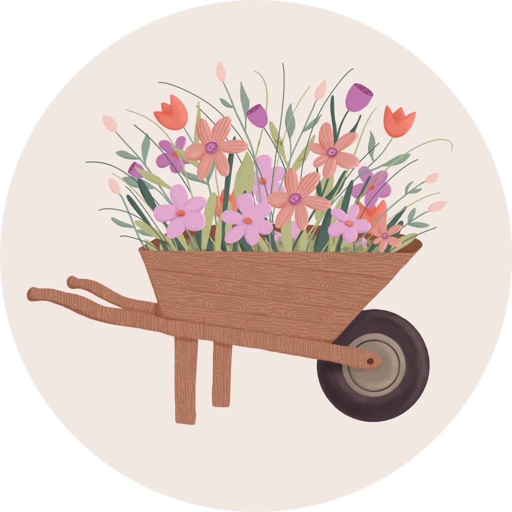 Een kleurrijke sticker met kruiwagen en paarse bloemen. Personaliseer het ontwerp eenvoudig in onze online editor.