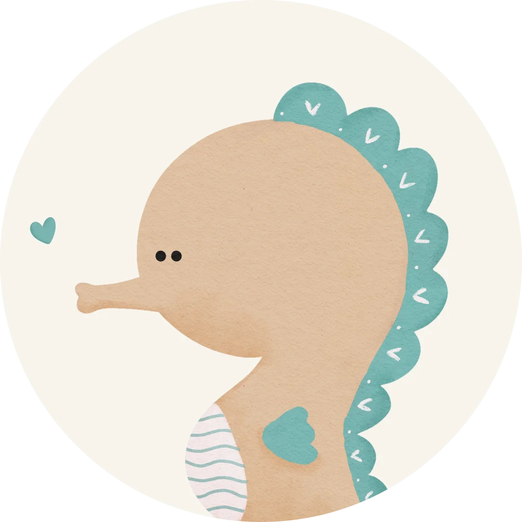 Ronde sluitzegel met een lief zeepaardje in zachte, natuurlijke tinten. De sluitzegel laat zich prachtig combineren met het bijpassende geboortekaartje en maakt het geheel helemaal af.