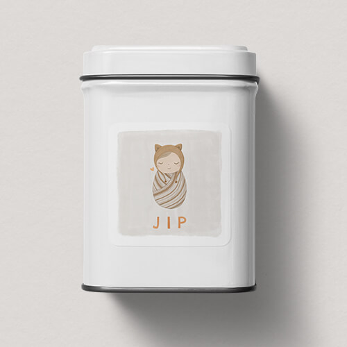 Lieve sticker voor een zoon of dochter met illustratie van een lieve baby met mutsje. Ideaal voor het versieren van doopsuiker of traktaties.