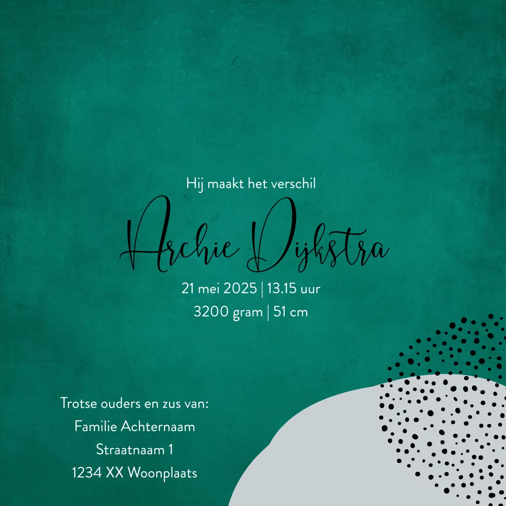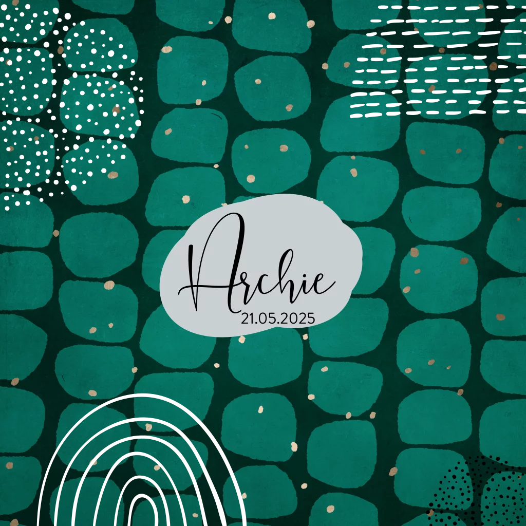 Een opvallend geboortekaartje met abstracte vormen in groen met grijs en zwart. Met accenten in zilverfolie. Wil je liever een andere kleur foliedruk? Dit kun je eenvoudig aanpassen in de online editor.