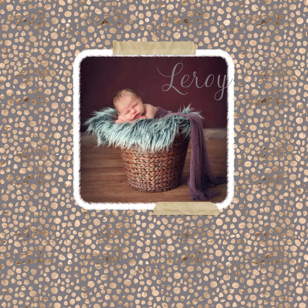 Geboortekaartje met foto en dierenprint in goud en grijs