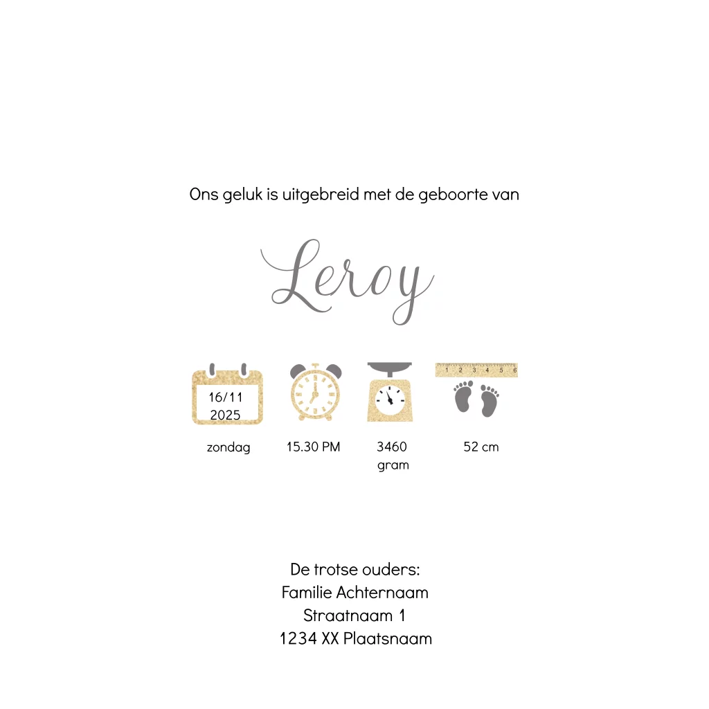 Een opvallend geboortekaartje met panterprint met goudeffect en grijze achtergrond. Na de geboorte kun je eenvoudig de foto van jullie kindje toevoegen voor een heel persoonlijk en origineel geboortekaartje. Dit geboortekaartje met foto is in meerdere kleuren verkrijgbaar.