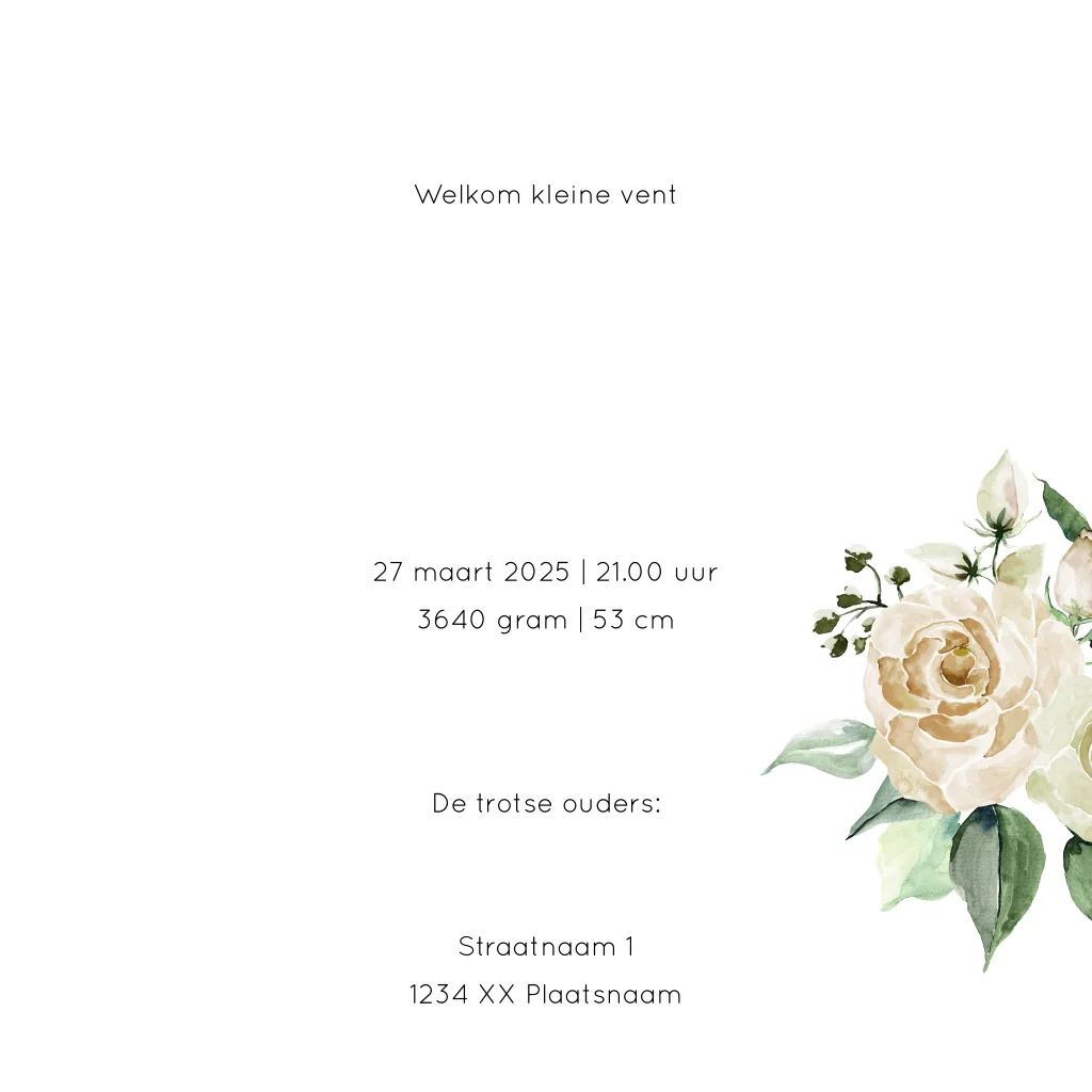 Een romantisch geboortekaartje met watercolour bloemen in wit en groen. De kleur van de goudolie en de lettertypes kun je eenvoudig aanpassen.
