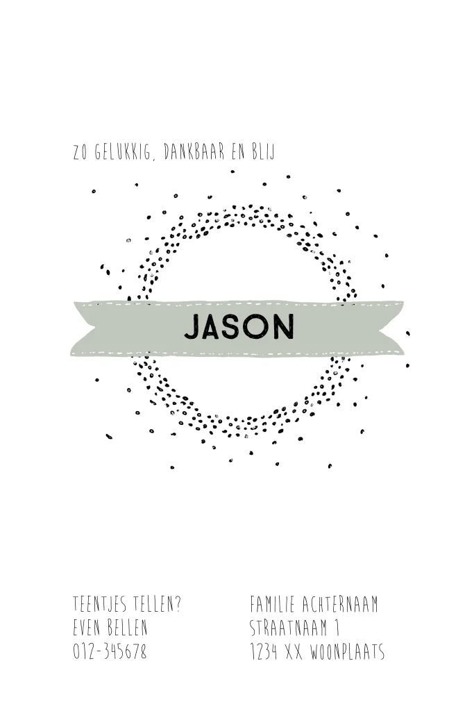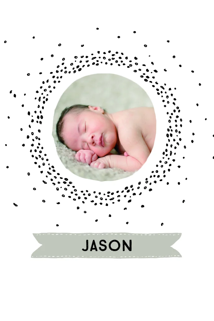 Hip geboortekaartje met stippen en banner in mint groen