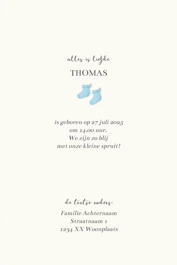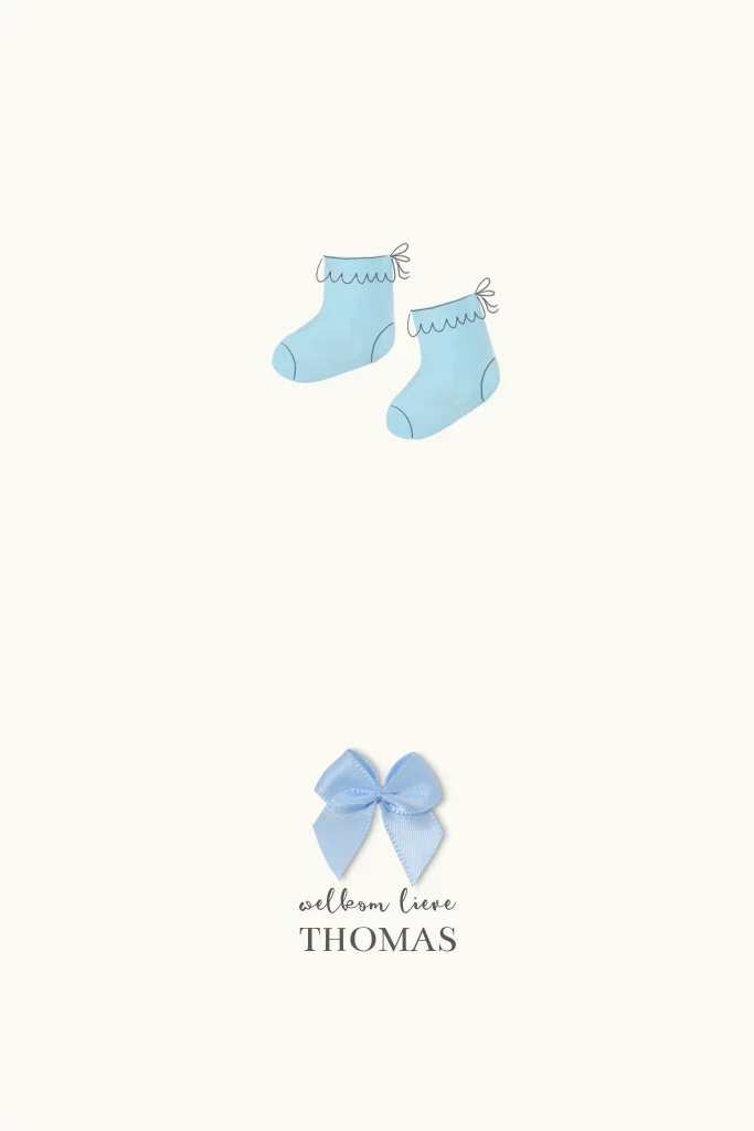 Een lief jongensgeboortekaartje met op de voorzijde een echt strikje en schattige blauwe babysokjes. Aan de binnenzijde kun je een foto van jullie zoontje plaatsen. Liever een andere kleur sokjes? Mail ons even. Het strikje op dit kaartje wordt niet afgedrukt, deze is alleen als voorbeeld. Op die plek kun je straks zelf het echte strikje plakken die je er apart bij bestelt.