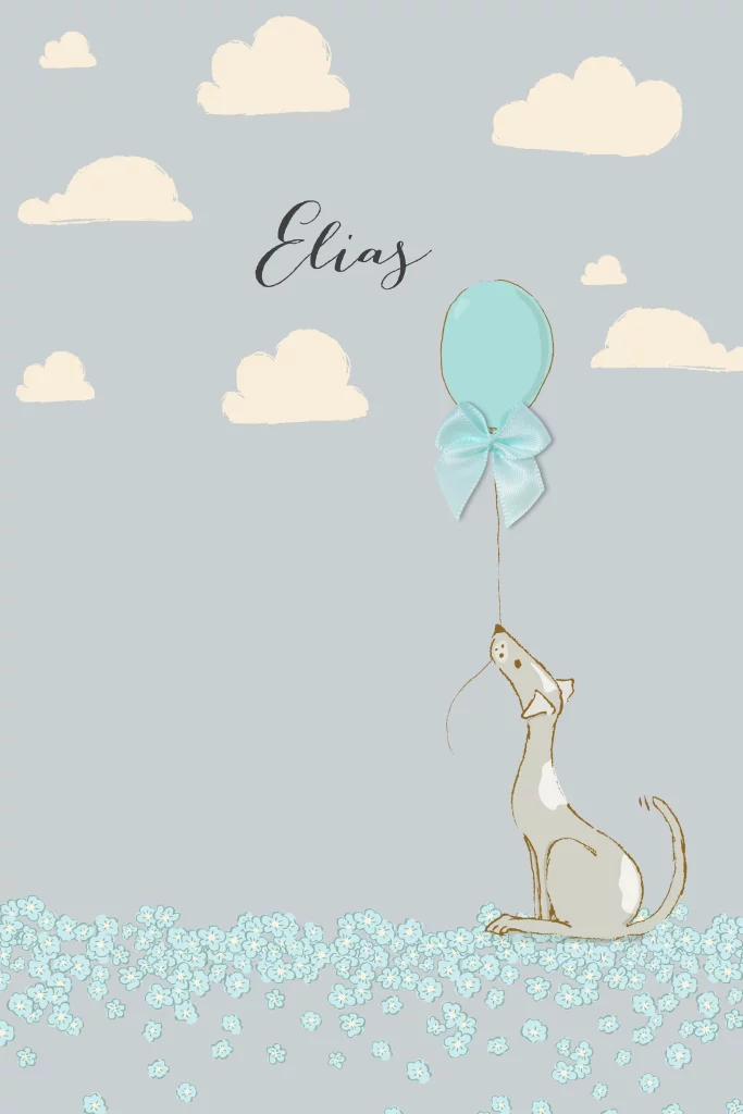 Een lief geboortekaartje met hondje met een blauwe ballon en blauwe bloemetjes. Een schattig en origineel geboortekaartje om de komst van jullie zoon of dochter aan te kondigen.