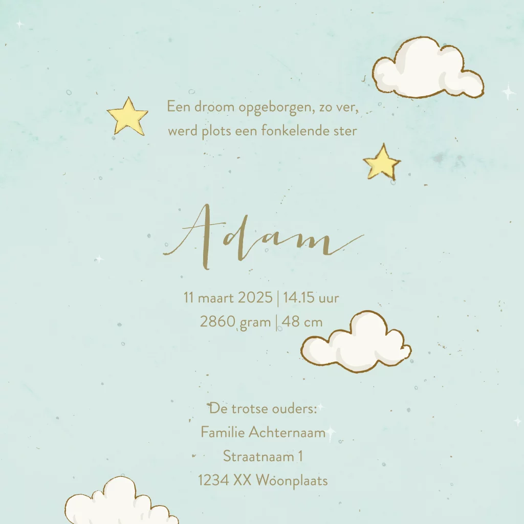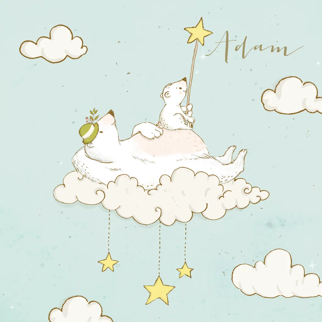 Een lief geboortekaartje met papa ijsbeer en baby ijsbeer op een wolk. De baby ijsbeer wijst de naam van jullie kindje aan. Een origineel geboortekaartje om de komst van jullie zoon of dochter aan te kondigen.