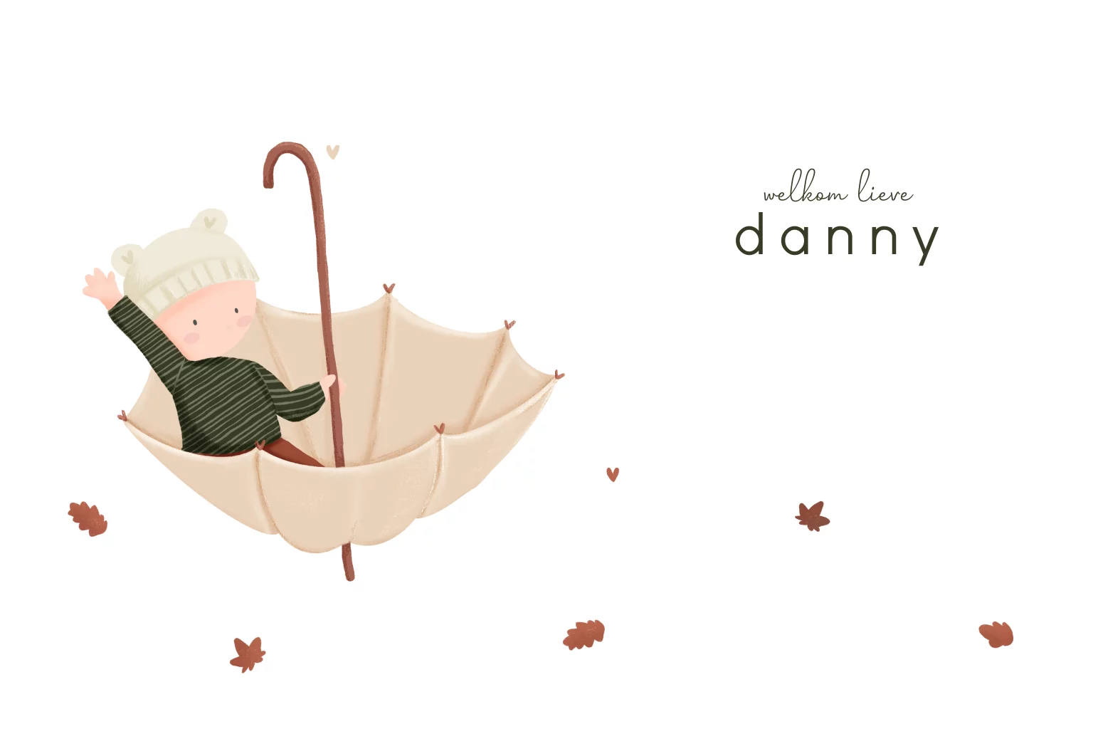 Een lief geboortekaartje met een schattige illustratie van een jongen in een paraplu omringd door dwarrelende herfstblaadjes. Een origineel geboortekaartje voor de aankondiging van de geboorte van jullie zoontje in de herfst. Pas het kaartje in de editor aan naar je eigen wensen. Kom je er niet uit of mis je elementen in de beeldbank? Neem contact met ons op, wij helpen je graag!