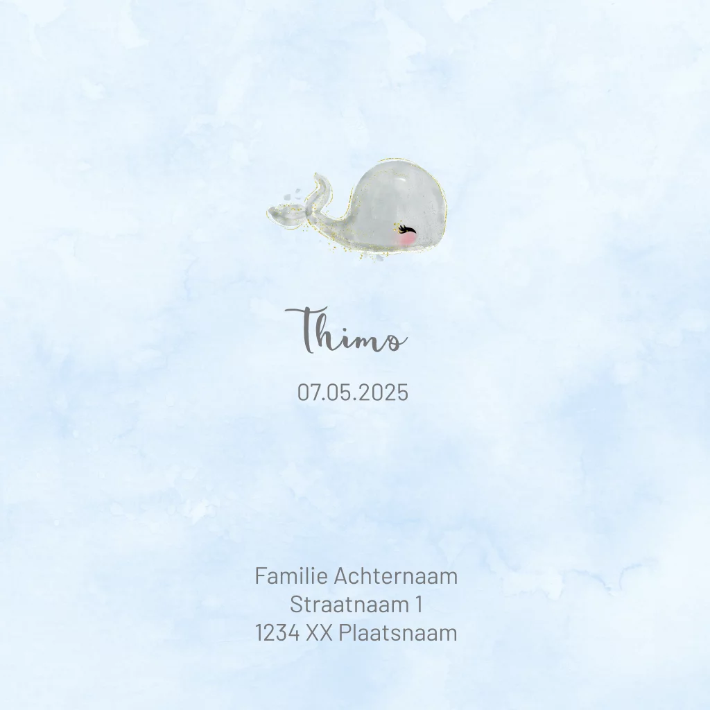 Een lief geboortekaartje met illustratie van een grijze walvis met ballon en goudkleurige effecten op een lichtblauwe achtergrond. De vrolijke illustraties geven het geboortekaartje een lieve maar ook opvallende uitstraling. Pas het geboortekaartje eenvoudig aan via de online editor.