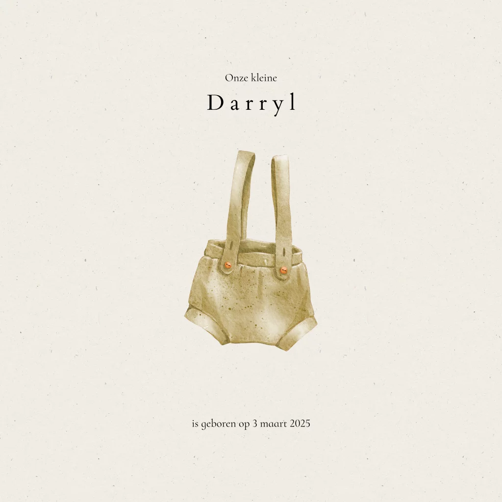 Dit lieve geboortekaartje met illustratie van tuinbroekje is superschattig om de geboorte van jullie zoontje bekend te maken. Pas het kaartje eenvoudig aan en bestel een proefdruk om dit geboortekaartje in het echt te bekijken.