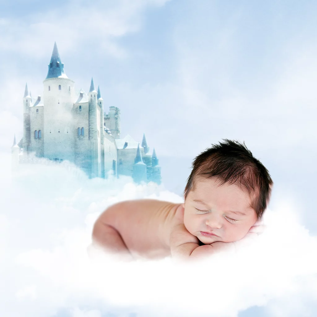 Een lief sprookjesgeboortekaartje met foto van jullie kindje en een kasteel in de wolken. Ook verkrijgbaar in roze.