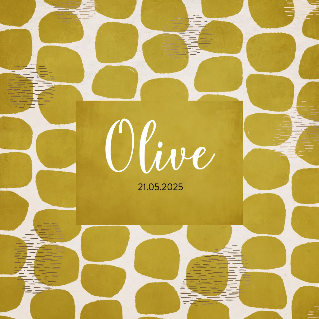 Een opvallend geboortekaartje met abstracte vormen in mosterdgeel en zwart. Met accenten in zilverfolie. Wil je liever een andere kleur foliedruk? Dit kun je eenvoudig aanpassen in de online editor.