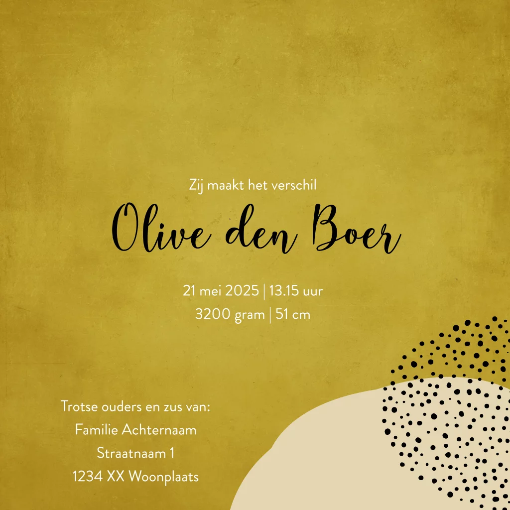 Geboortekaartje abstract mosterdgeel stippen met zilverfolie