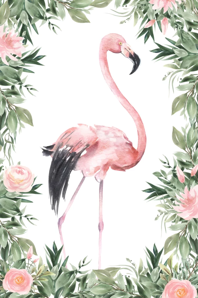 Een hip geboortekaartje voor meisjes met flamingo en jungle bladeren en roze bloemen. Om het waterverf effect nog beter uit te laten komen, kun je dit geboortekaartje op oud-Hollands papier laten drukken.