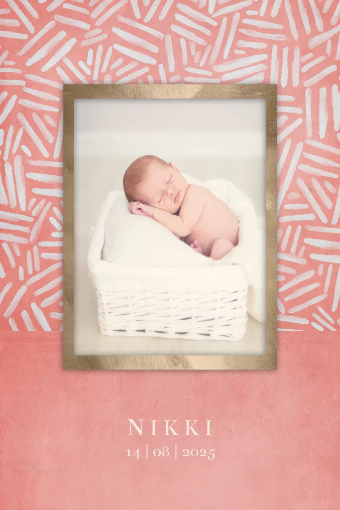 Een chique geboortekaartje met achtergrond in waterverf in de kleur peach (perzik roze). Op de voorkant is een goudkleurige fotolijst waar je een mooie foto van jullie dochter kunt plaatsen. Ook verkrijgbaar in donkerblauw.