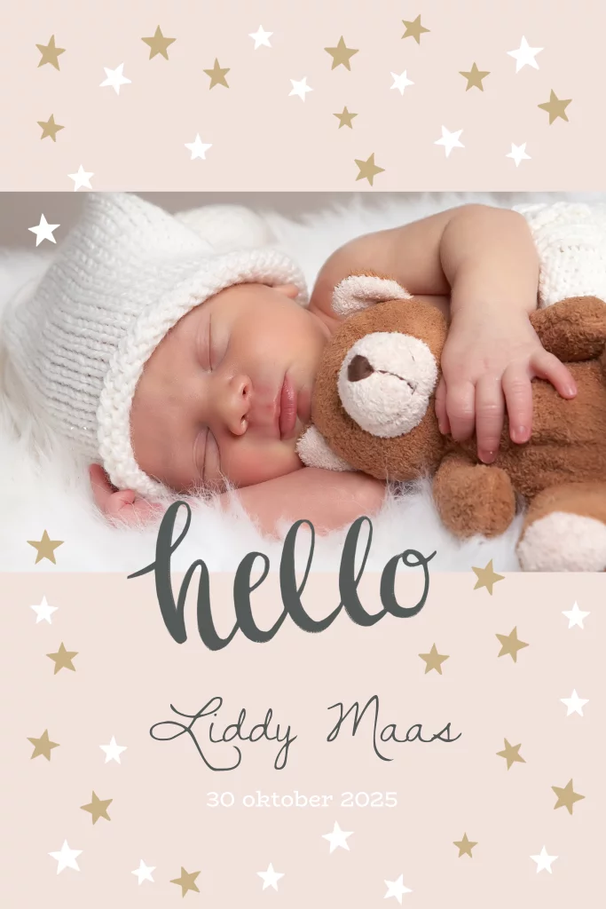 Een hip geboortekaartje met sterretjes en een foto van jullie eigen dochter. Een heel persoonlijk en origineel geboortekaartje om jullie dochtertje voor te stellen aan jullie familie, vrienden en kennissen. Liever een andere kleur? Dit is eenvoudig aan te passen in de online editor.